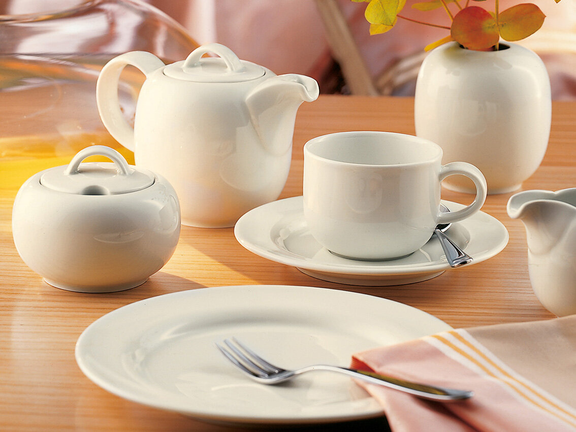 Die runden Teller werden mit und ohne Relief angeboten. Die für den Bankettbereich unerläßlichen stapelbaren Tassen runden das Angebot ab.