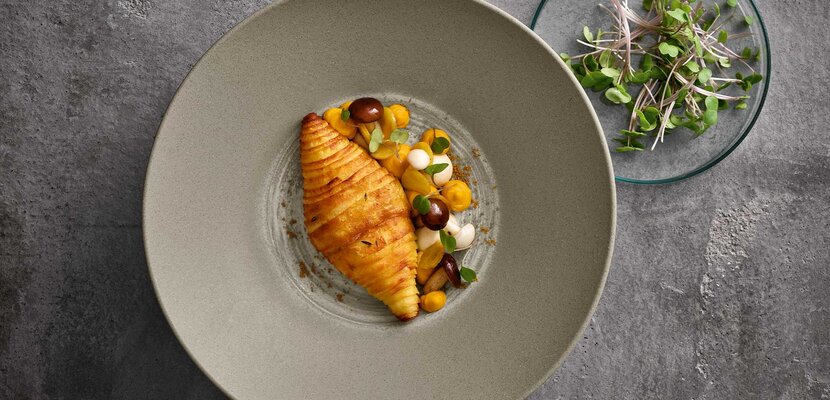 Kartoffelcroissant, Kürbis, Vadouvan und Buchenpilze
