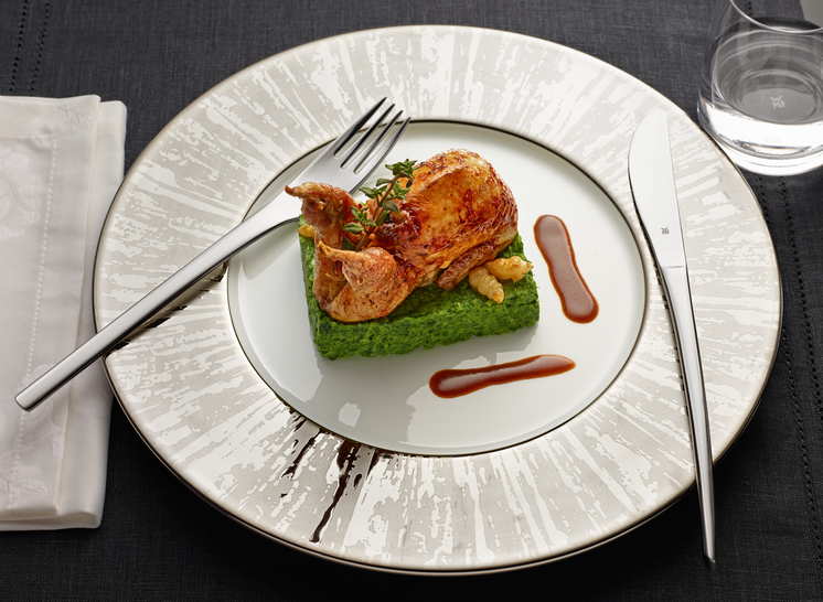"Das Schieferdekor ist ein echter Hingucker, der mit Robustheit und Stoßfestigkeit überzeugt und keine Abnutzungsspuren durch Besteck zeigt. Unsere Gäste schätzen an diesem Dekor das ungebremste, kulinarische Vergnügen: Im Gegensatz zum Naturstein punktet der Zwilling aus Porzellan mit seiner glatten Oberfläche bei gleicher Optik."