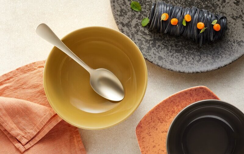 Coupteller oder Teller mit kleiner Fahne bieten durch die große Speisefläche z. B. besonders viel Platz für das Food-Styling. Das heißt allerdings nicht, dass das Gericht über den gesamten Teller angerichtet werden muss. “Hochstapeln” ist auch eine mögliche Form: Dabei wird das Gericht von einem zentralen Punkt aus turmförmig nach oben gestapelt. Der dreidimensionale Look verwöhnt dabei das Auge des Betrachters und hilft mit der richtigen Technik den Materialeinsatz zu minimieren. Weniger ist also mehr und macht aus dem Gericht ein Erlebnis.