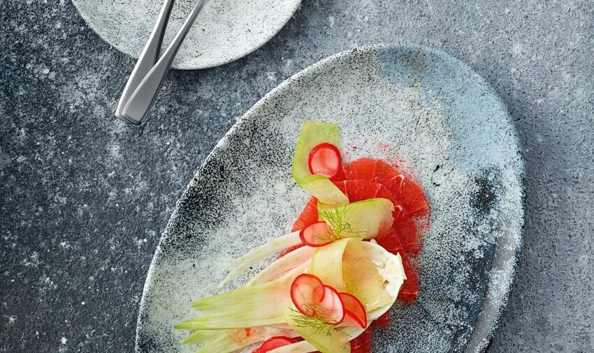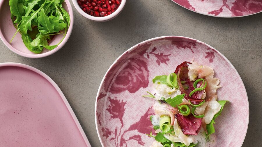 Monika Schuster ist unsere Food-Stylistin, Hotelfachfrau und Köchin in der Meisterschule für Köche. Sie ist überzeugt von außergewöhnlichen Tellern mit farbigem Dekor. Sie erklärt: „Das Anrichten auf dem Teller gibt dem Essen oft eine besondere Note. Dabei bietet die Farbe des Porzellans eine schöne Plattform: Vor allem Blau bietet dem Essen eine große Unterstützung, da es nicht mit den natürlichen Farben der Lebensmittel konkurriert.“ Auch Dekore mit Flechten oder Blüten liegen derzeit im Trend. Das Dekor wirkt dabei wie eine schützende Hand, um die üppige oder auch reduzierte Präsentation individueller Kreationen zu gewährleisten.