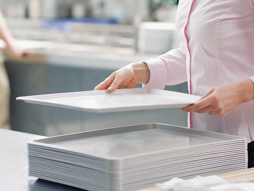 Spülbetrieb gegen Bruch. Eine perfekte Stapelung, eine gute Belüftung und somit schnelle Trocknung unterstützen die Stapelnocken. Tabletts werden sowohl in der allgemein gültigen