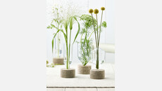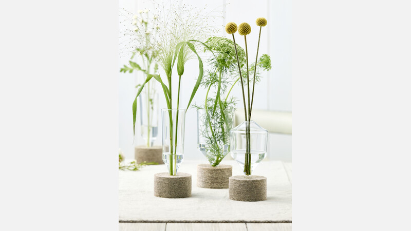 Transparente Magie vermitteln die Vasen mit einem funktionalen Stecksystem aus Glas und Filz. In ihrer schwebenden und zurückhaltenden Gestaltung passen sie perfekt in jedes Ambiente. Design: Carsten Gollnick.