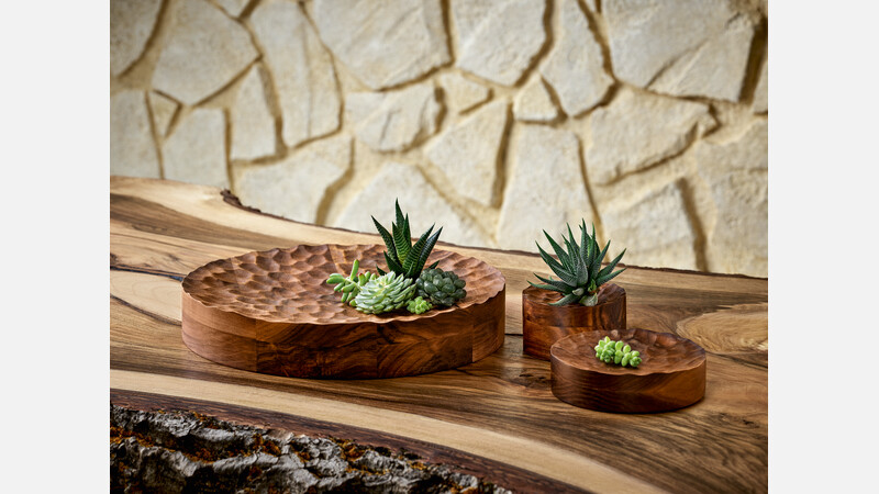 Ob als Solist auf einem Rezeptions-Tresen oder als Centre Piece bei Tisch – die handgefrästen Plateaus aus der Kollektion ELEVATE aus Eichenholz oder Nussbaum sind markante Statements und vielseitig einsetzbar.-