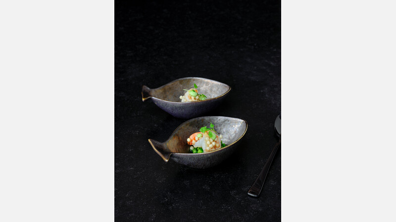 Die 14 cm Fisch-Bowl aus der PLAYGROUND Kollektion SHELLS eignet sich für kleine Fischportionen, marinierte Zutaten, Beilagen oder ergänzende Komponenten der Küstenküche. Die kompakte Form setzt einen leicht verspielten Akzent, bleibt jedoch der ruhigen, skulpturalen Anmutung der Serie treu. Die Shells Glasur zeigt eine dezent verwitterte Oberfläche, die an natürlich gealterte maritime Strukturen erinnert. Gefertigt aus robustem Steinzeug ist die Bowl für den täglichen Profi-Einsatz geeignet und spülmaschinenfest. Sie bietet Küchen ein markantes Serviceteil für Degustationsgänge, Seafood-Begleitungen oder fein strukturierte Beilagen.-