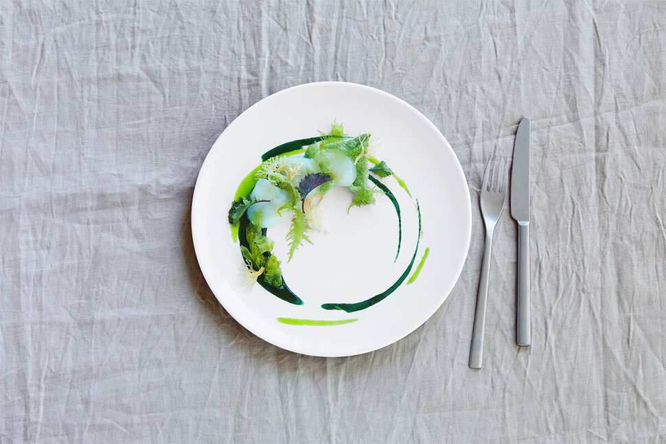 - Arrange the risotto on plates, spread the roasted green asparagus and the diced rhubarb on top. Garnish each with two strips of bacon.