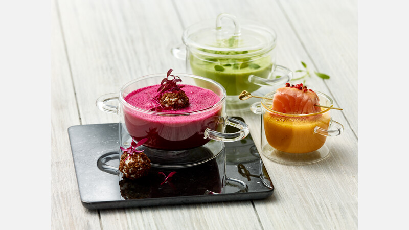 Head-turners with a thermal function. The double-walled pots made by hand from borosilicate glass keep food hot or cold longer. At the same time, the vacuum between glass walls prevents the build-up condensation, when the glass appears to ‘sweat’. Ideal for hors d’oeuvres, small soups and ice cream creations, especially at a buffet.-