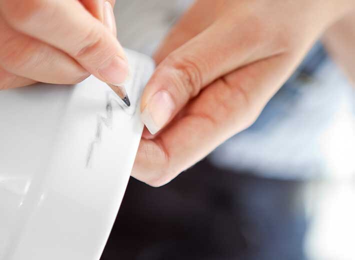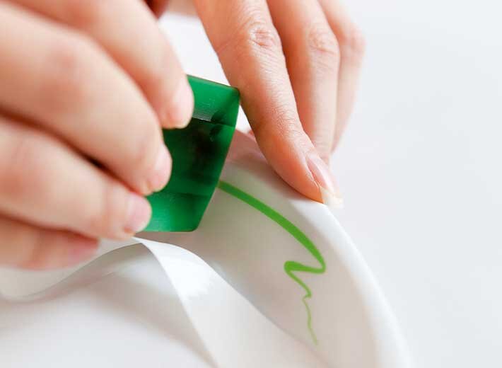 In underglaze decoration, the decoration is applied to the porcelain piece directly after the glow firing (1st firing). Due to the high glost firing temperature (2nd firing) at over 1,400 °C, the color range is significantly limited, as many of the porcelain colors cannot withstand such a high temperature. At BHS tabletop, only the green base stamp is stamped onto the porcelain body directly after the 1st firing and thus processed in the underglaze process.