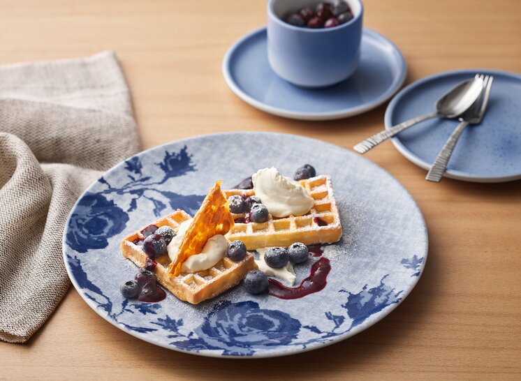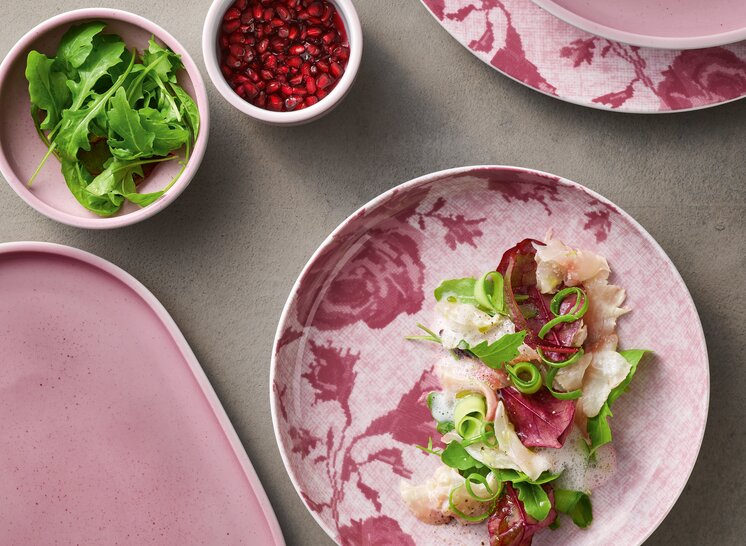 The MASH-UP decor concept is characterized by positive colors in blue and pink. In addition, the tableware impresses with its interesting variety of patterns. Floral patterns, swirls and "stitch looks" in blue and pink adorn the tableware. Also with ombré color gradients or solid colors with delicate speckles, these statement decors become a real eye-catcher in many locations. Blue dinnerware works well as a contrast to food in warm colors whereas pink dinnerware goes tone-on-tone with red fruits and vegetables. True to the motto mix and match, not only the new blue and pink colors and the different decors can be combined well, but also existing white tableware from UNLIMITED and SHIRO.